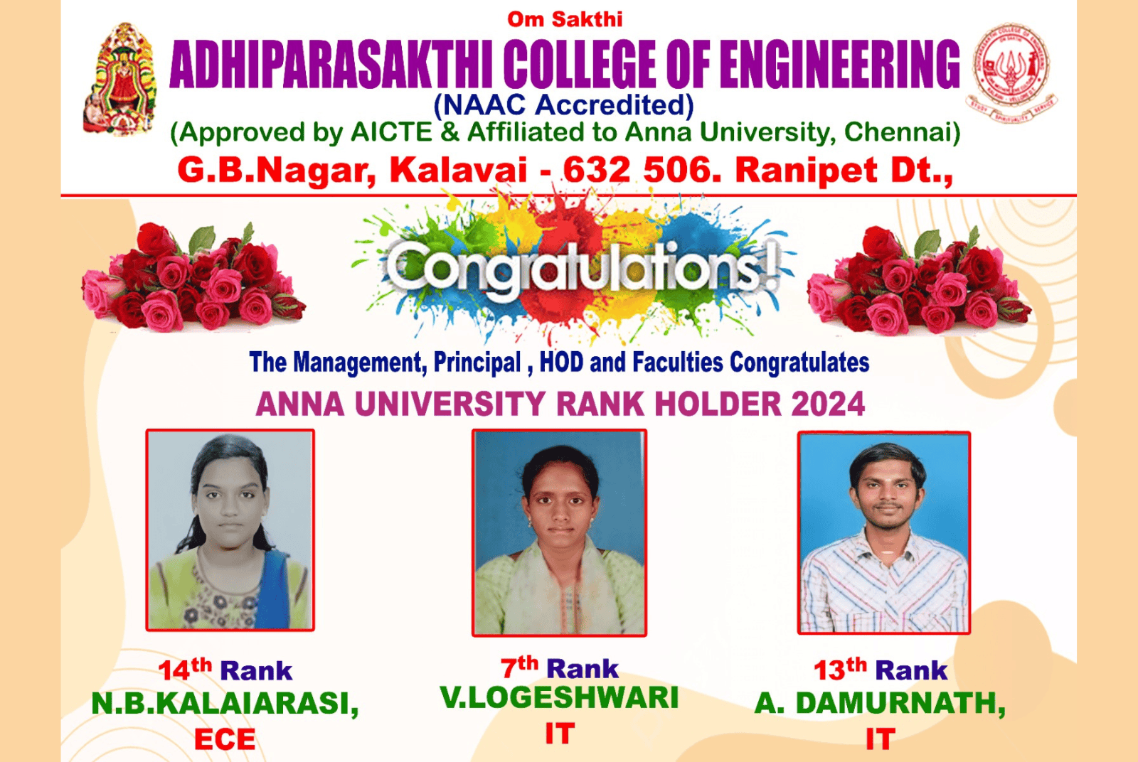 Adhiparasakthi College of Engineering (APCE) was established in the year 2001 under the blessings of the Founder President, His Holiness Arulthiru Amma Padma Shri Bangaru Adigalar. The institution was founded to address the growing demands for engineers in modern industries. It operates under the governance of Thirumathi V. Lakshmi Bangaru Adigalar, President of the ASPWC Trust”.