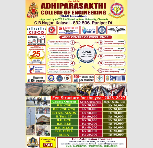 Adhiparasakthi College of Engineering (APCE) was established in the year 2001 under the blessings of the Founder President, His Holiness Arulthiru Amma Padma Shri Bangaru Adigalar. The institution was founded to address the growing demands for engineers in modern industries. It operates under the governance of Thirumathi V. Lakshmi Bangaru Adigalar, President of the ASPWC Trust”.